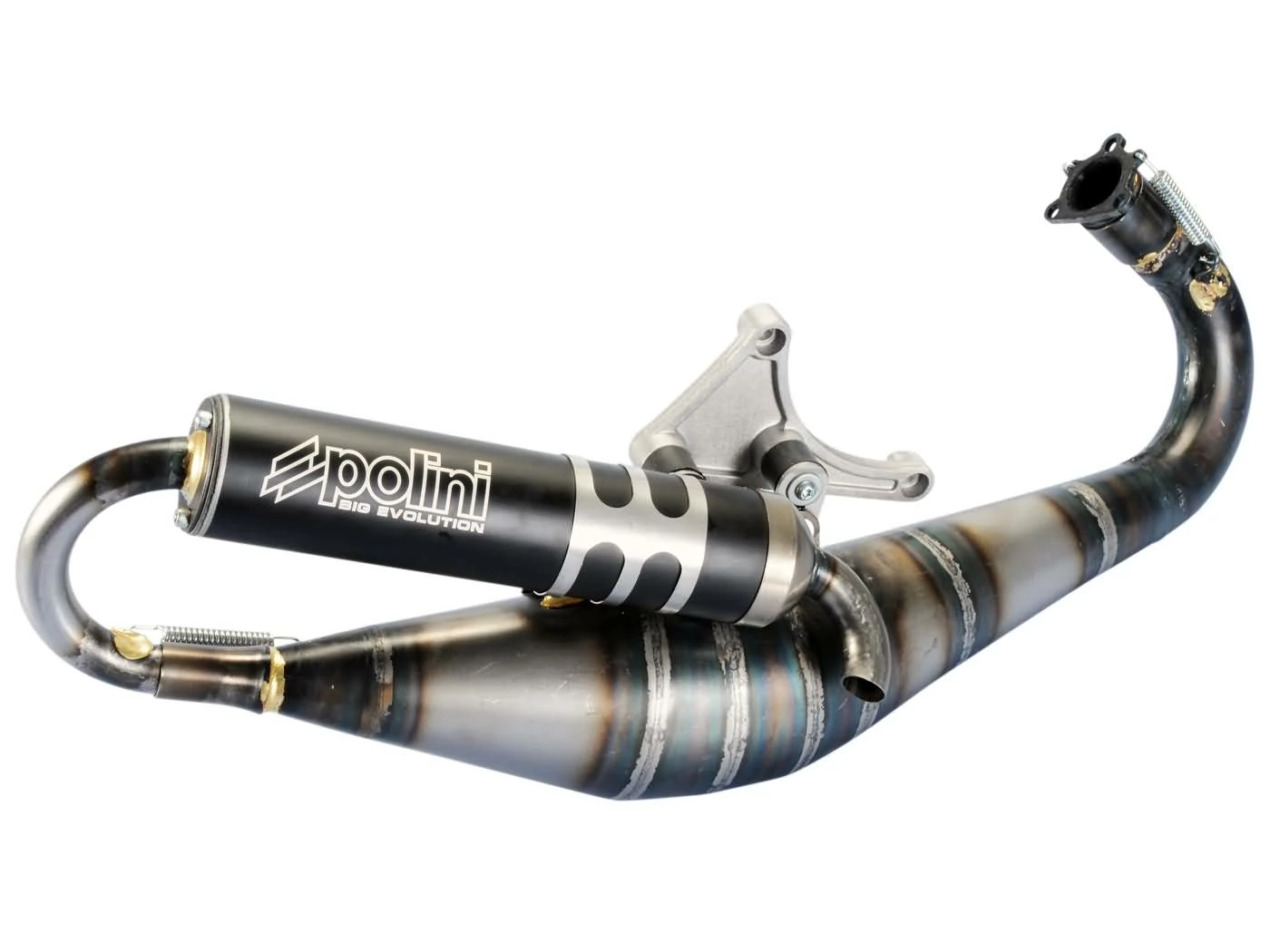Die Big Evolution Auspuffanlagen wurden speziell für die Big Evolution Zylinderkits entwickelt, um die letzten Leistungsreserven aus den Motoren herauszuholen. Um der höheren Kompression dieser Zylinder standzuhalten, verwenden sie einen speziellen Auspuffflansch mit 3-Punkt Befestigung. Daher sind die Big-Evolution Auspuffanlagen auch nur in Verbindung mit dem passenden Big-Evolution Zylinderkit zu verwenden. Darüber hinaus, passt die mitgelieferte Halterung auch an die optional erhältliche Polini Torsen WD Zusatzschwinge. Diese verleiht stark getunten Motoren die nötige Stabilität, indem sie das Kurbelgehäuse entlastet.