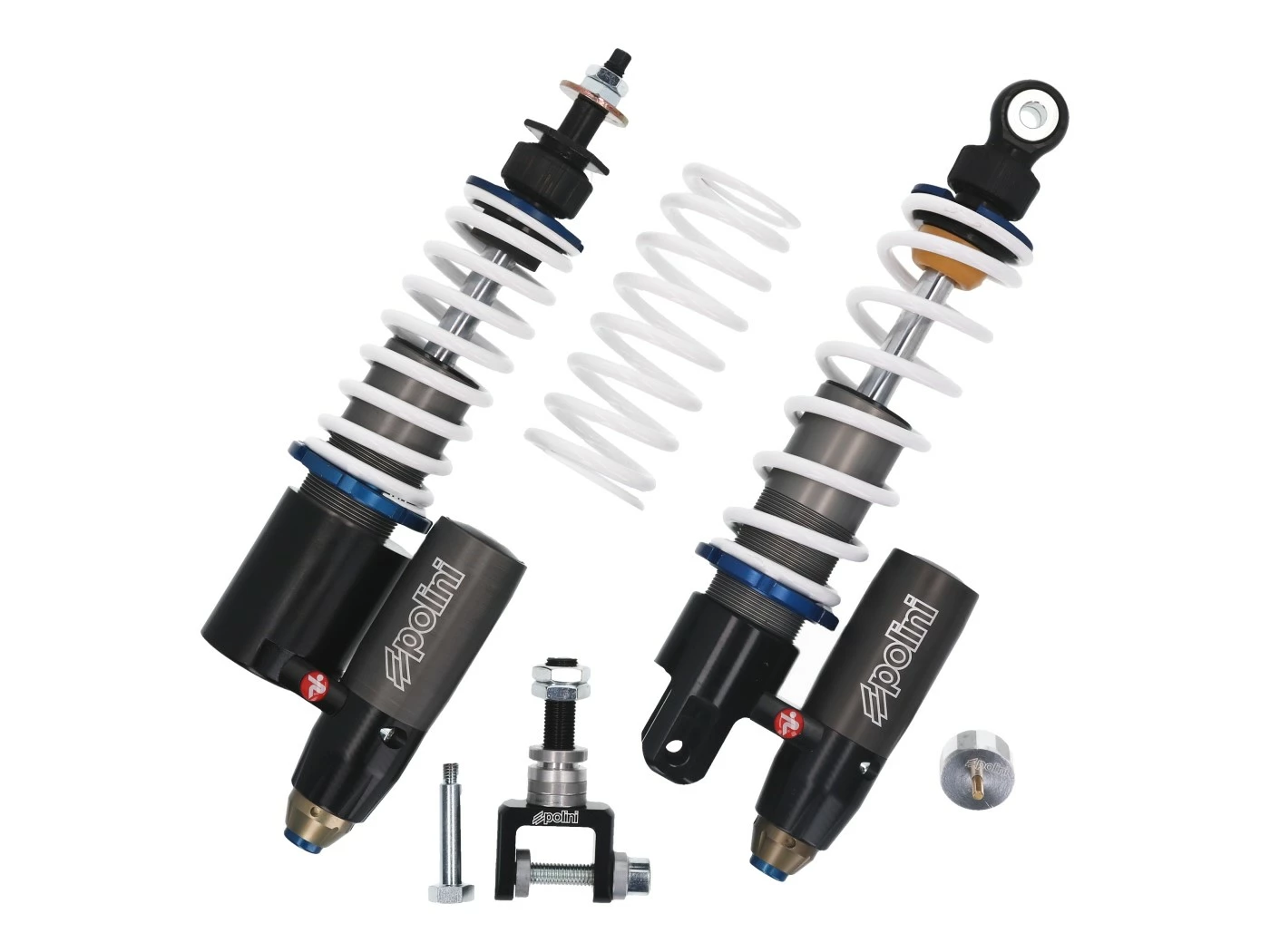 Das Set besteht aus zwei voll einstellbaren Racing Stoßdämpfern (vorn und hinten) für Piaggio Quartz, Zip SP und Zip 2 SP Motorroller.