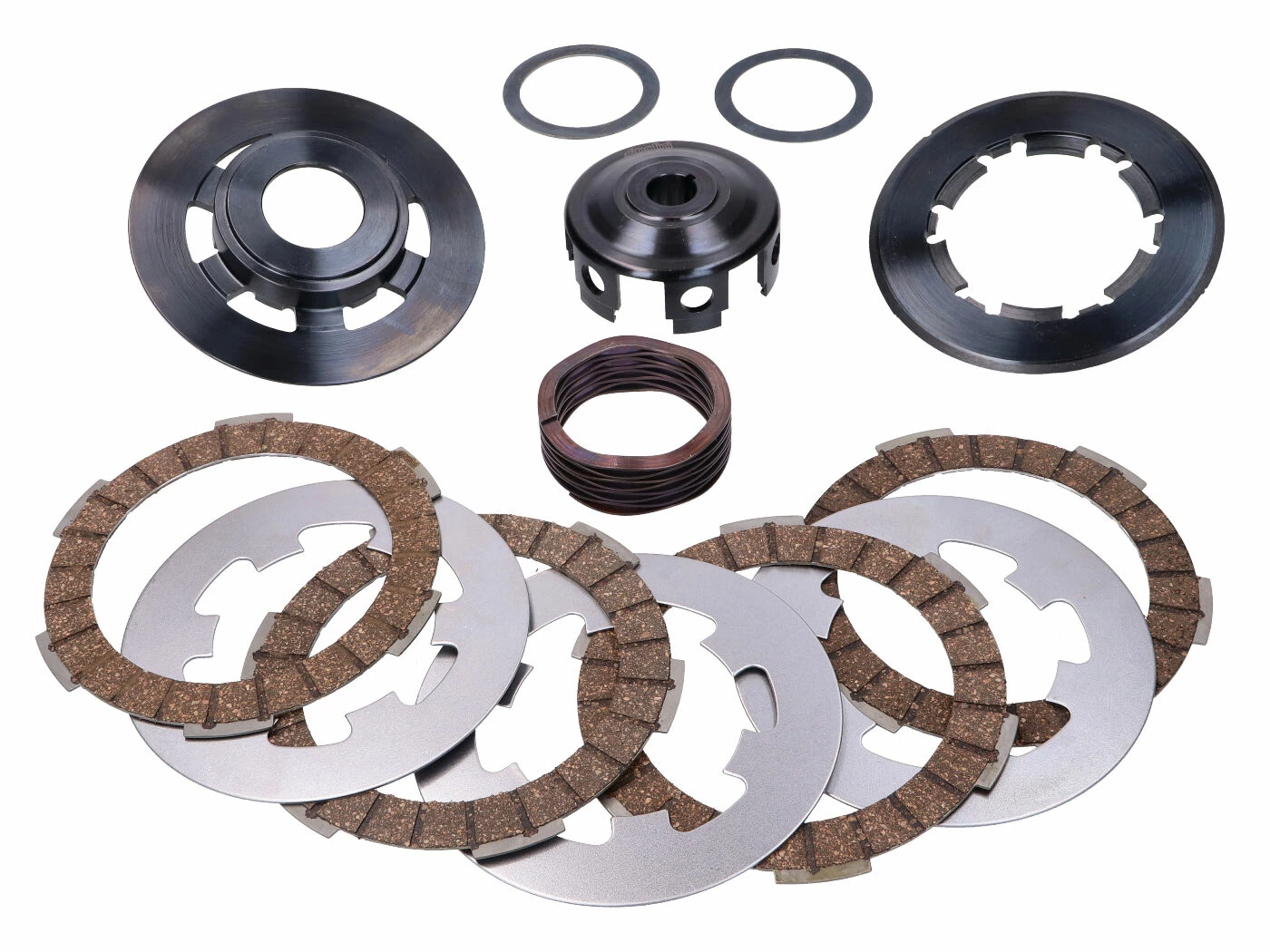 Die innovative Wellenfeder wurde hochpräzise konstruiert. Durch die Wabenstruktur wird mit dieser Feder eine gleichmäßige Druckverteilung auf die Reibflächen erreicht. Damit kann ein Druck von bis zu 200kg aufgebaut werden. Dazu muss der Anpresspunkt der Feder mithilfe der im Kit enthaltenen Einstellscheiben angepasst werden. Die Standardeinstellung liegt bei 80kg. Damit die Wellenfeder optimal sitzt, verfügt die Kupplungsnabe über einen speziellen Zentriersitz. Die Kupplungsnabe und die Trennscheiben bestehen aus Nitritstahl (erhöhter Reibungskoeffizient).