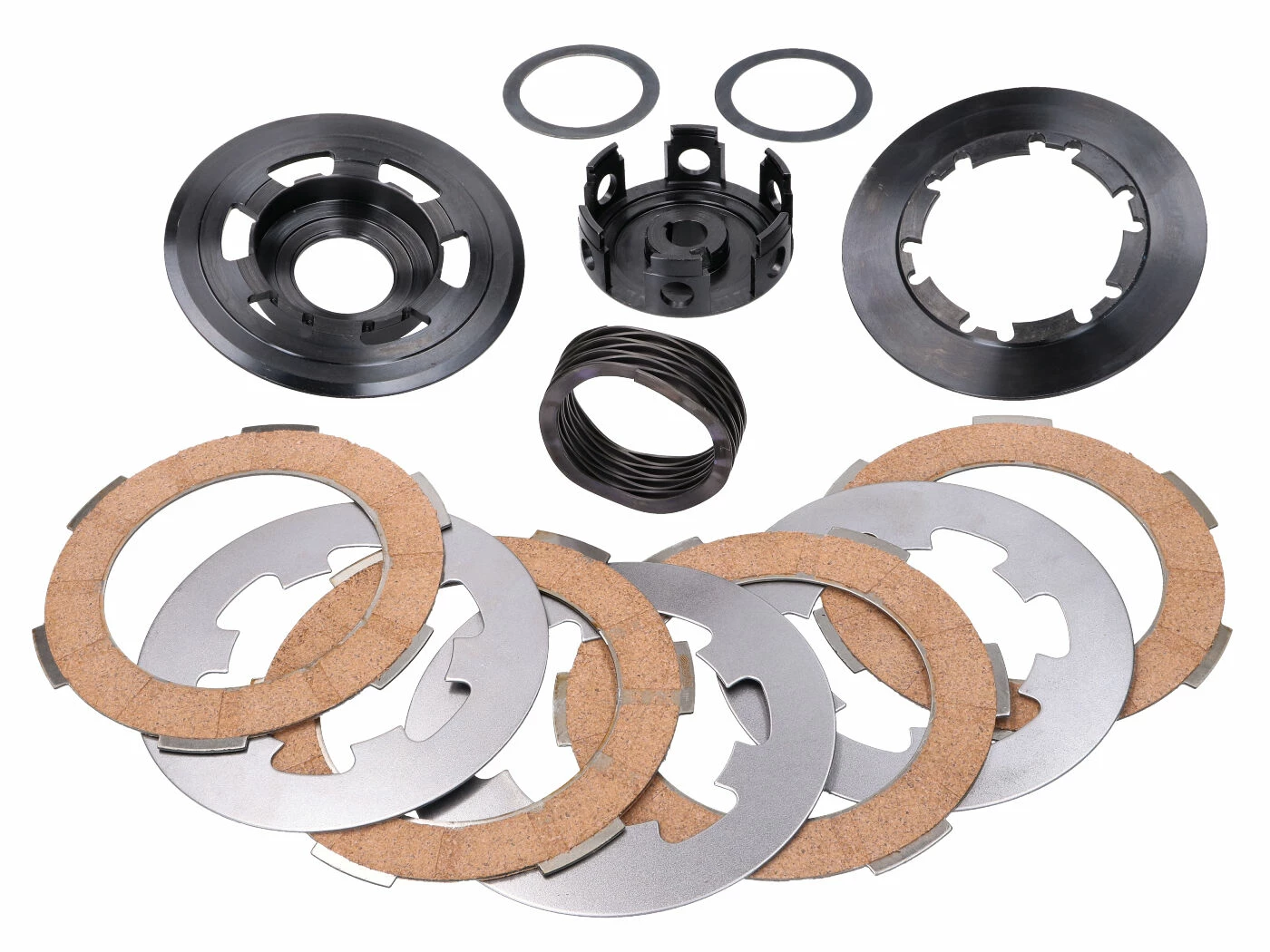 Die innovative Wellenfeder wurde hochpräzise konstruiert. Durch die Wabenstruktur wird mit dieser Feder eine gleichmäßige Druckverteilung auf die Reibflächen erreicht. Damit kann ein Druck von bis zu 200kg aufgebaut werden. Dazu muss der Anpresspunkt der Feder mithilfe der im Kit enthaltenen Einstellscheiben angepasst werden. Die Standardeinstellung liegt bei 80kg. Damit die Wellenfeder optimal sitzt, verfügt die Kupplungsnabe über einen speziellen Zentriersitz. Die Kupplungsnabe und die Trennscheiben bestehen aus Nitritstahl (erhöhter Reibungskoeffizient).