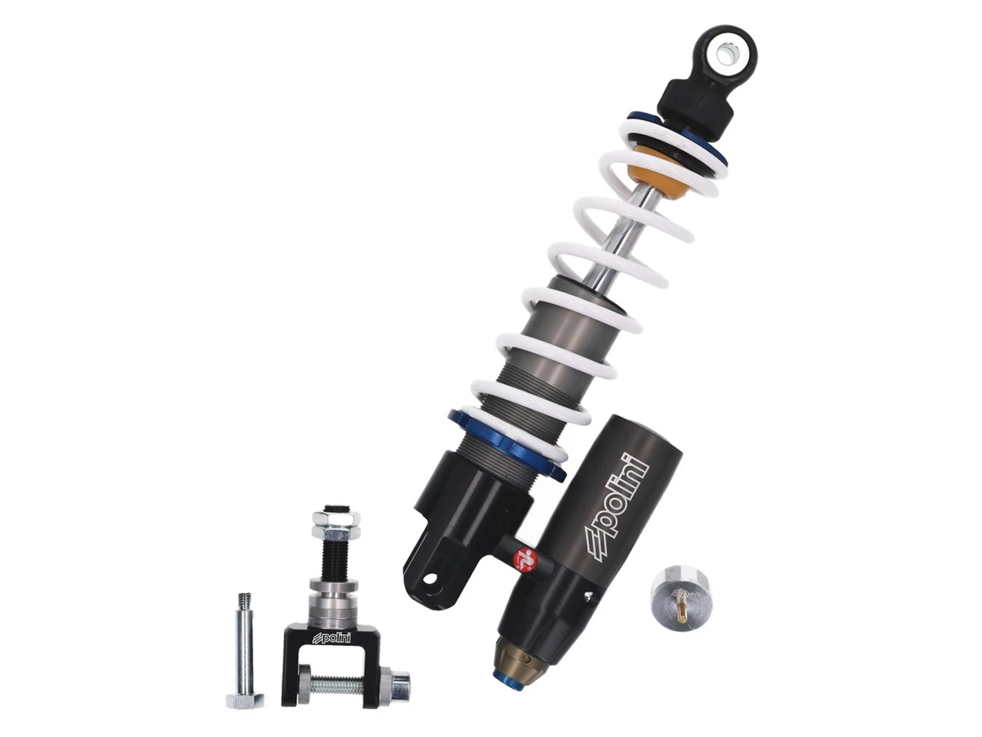 Voll einstellbarer Racing Stoßdämpfer für das Hinterrad diverser Piaggio, Gilera & Aprilia Roller mit Piaggio Motor. Der High-End Dämpfer wird für Polini exklusiv vom Fahrwerksspezialisten Paioli gefertigt.