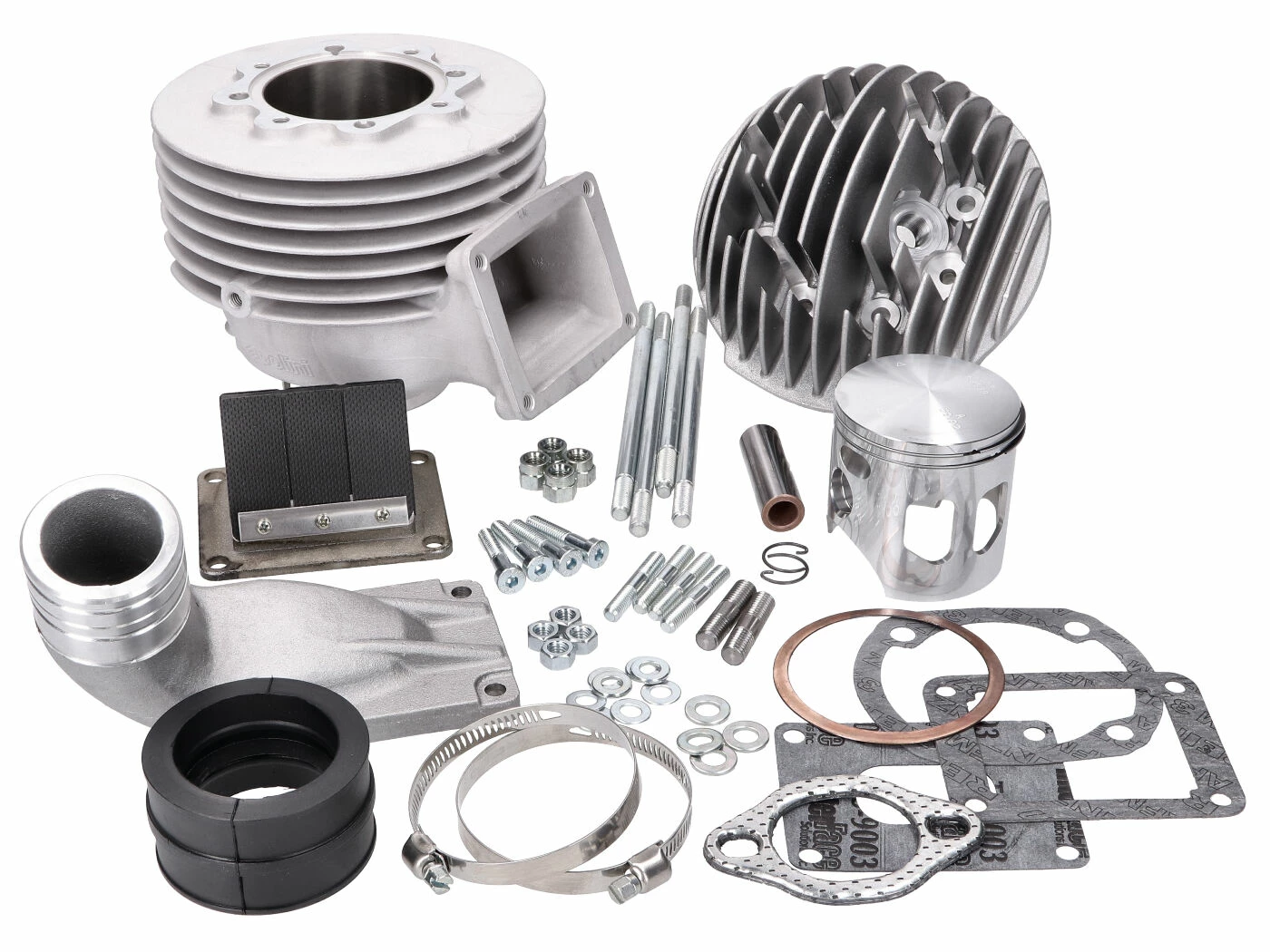 Dank der 152ccm Hubraum bietet der Reed Mission Zylinderkit eine unglaubliche Performance! Egal ob täglich oder Rennstrecke, dieser Zylinder setzt neue Leistungsmaßstäbe. Aus Aluminium gefertigt, mit Nickel-Silizium beschichtete Laufbuchse, 6 Überströmkanäle mit Racing Steuerzeiten, geteilter Auslass und natürlich die Membran-Steuerung, um nur einige Features zu nennen. Beim Zylinderkopf-Design wurden zusätzliche Kühlrippen ergänzt, um die Wärmeableitung nochmals zu verbessern. Auch die leicht erhöhte Kompression trägt dazu bei, ein Maximum an Leistung aus der 60mm-Bohrung bei 54mm Hub zu holen. Der Kolben ist aus Aluminium gegossen und hat zwei verchromte S10-Gussringe. Nach der Bearbeitung wurde der Kolben mit einer speziellen Molybdän-Bisulfid-Beschichtung versehen, die das Gleiten des Kolbens während der Einlaufphase verbessert. Der Membranblock hat 6 Karbonklappen mit 0,4mm Stärke. Die Geometrie der Strömungsführung garantiert eine optimale Eintrittsgeschwindigkeit des Luft-Benzin-Gemisches. Der Ansaugkrümmer wurde so entwickelt, dass er ohne jegliche Modifikation an seinem ursprünglichen Platz untergebracht werden kann und mit dem d.34 Dellorto VHSB-Vergaser zusammen gut arbeitet.